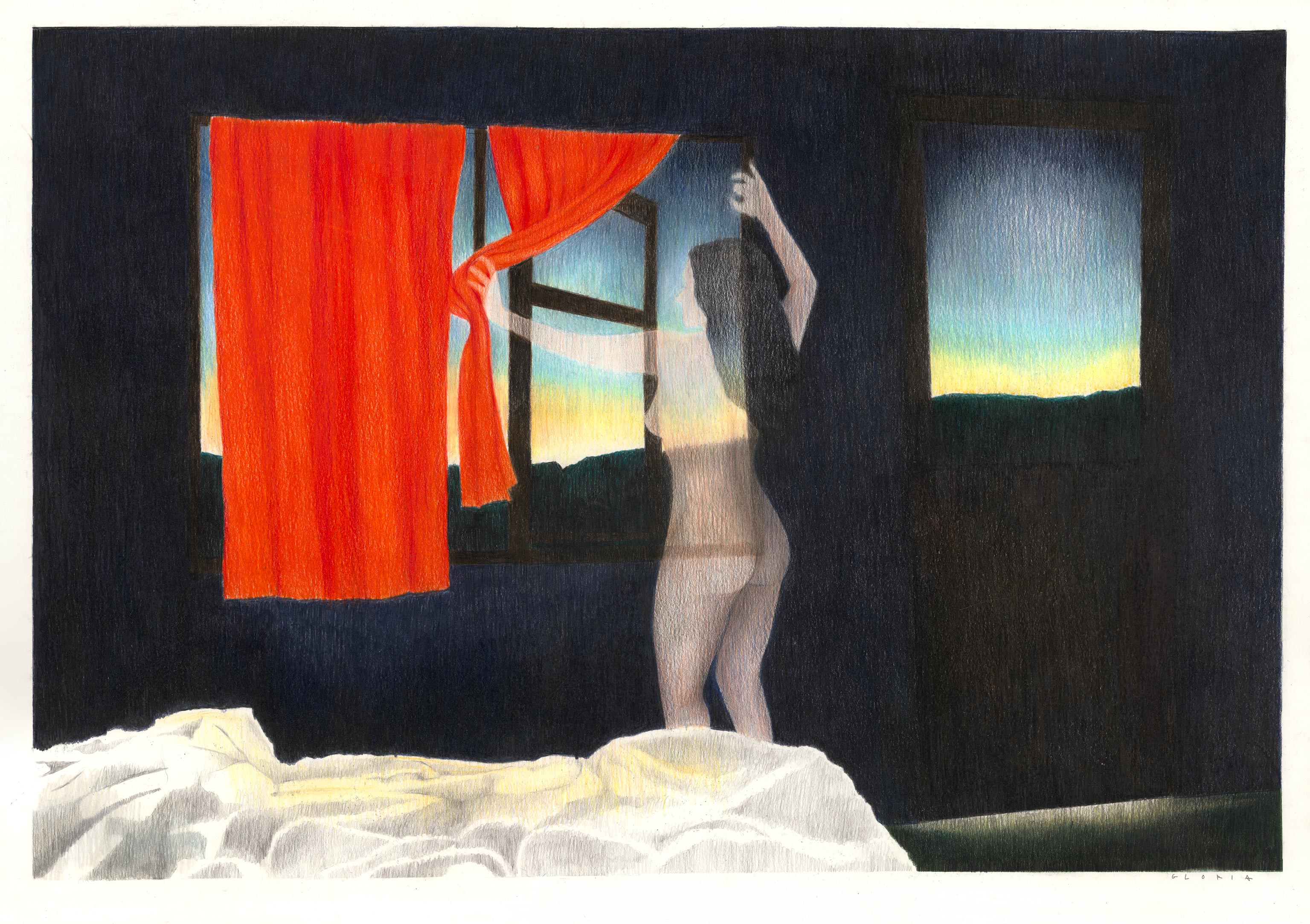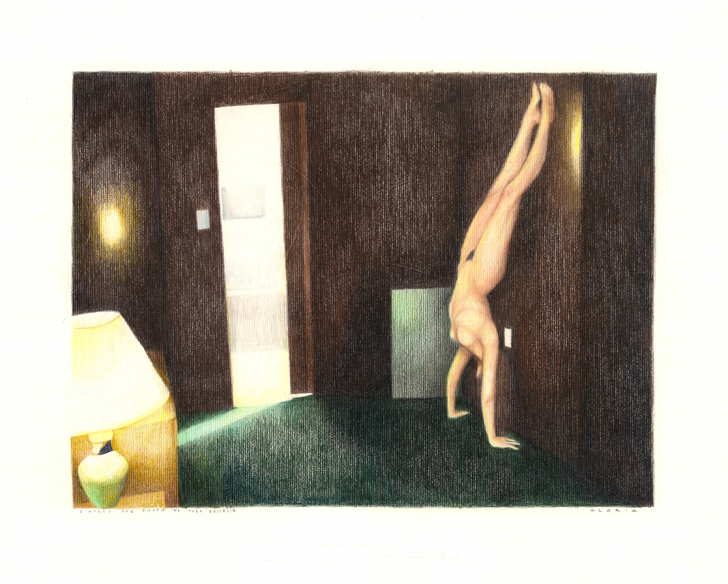 Elle parle de son accrochage comme d’un voyage, jalonné d’étapes. Avec un jeu de superposition de crayons de couleur, elle crée des ambiances crépusculaires et autres lumières nocturnes, tels des clins d’oeil aux « road movies », à l’errance d’un Kerouac ou d’un Wenders à travers les grands espaces américains. Ses personnages se font rares ou tout en délicatesse et transparence. Ils paraissent rêveurs, nostalgiques ou observateurs. Parfois nus ou vêtus de blanc. Une présence discrète et puissante à la fois. Le trait de Gloria Avril est rythmé, pur, déjà sûr et assuré. « Avec cette première série, j’ai développé une écriture graphique nouvelle. Une technique à la fois lente, qui me correspond bien car j’ai moi-même besoin de prendre du temps, et en même temps rapide comme une pulsion, un besoin de retranscrire sur le papier la scène que j’imagine dans mon esprit. Je dois rester très concentrée pour ne pas perdre cette image. Il faut alors que je dessine vite. » Autre signe particulier : « Je ne fais pas de fond. Je garde du blanc du papier, pour faire respirer le dessin, apporter de la lumière. » Un tic qu’elle a emprunté à sa mère, reconnaît-elle. « J’avais envie d’exposer. Je sentais que c’était le bon moment », poursuit Gloria Avril. La proposition de la Galerie Les Arts dessinés l’a beaucoup touché. « Je suis fière et honorée de pouvoir exposer pour la première fois aux côtés de ma mère. Car bien que nos univers soient très distincts c’est touchant qu’elle soit là, à mes côtés à travers ses dessins. »