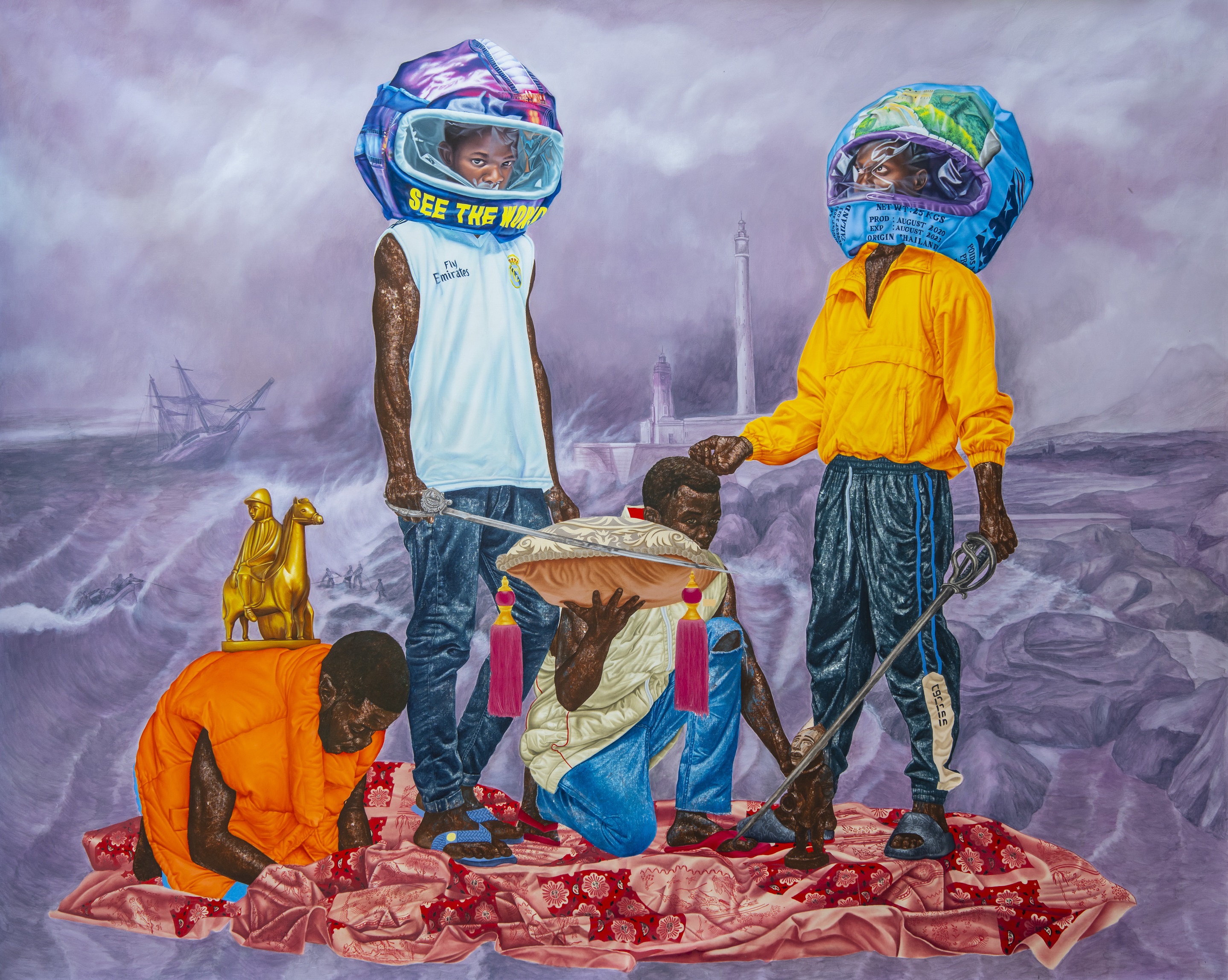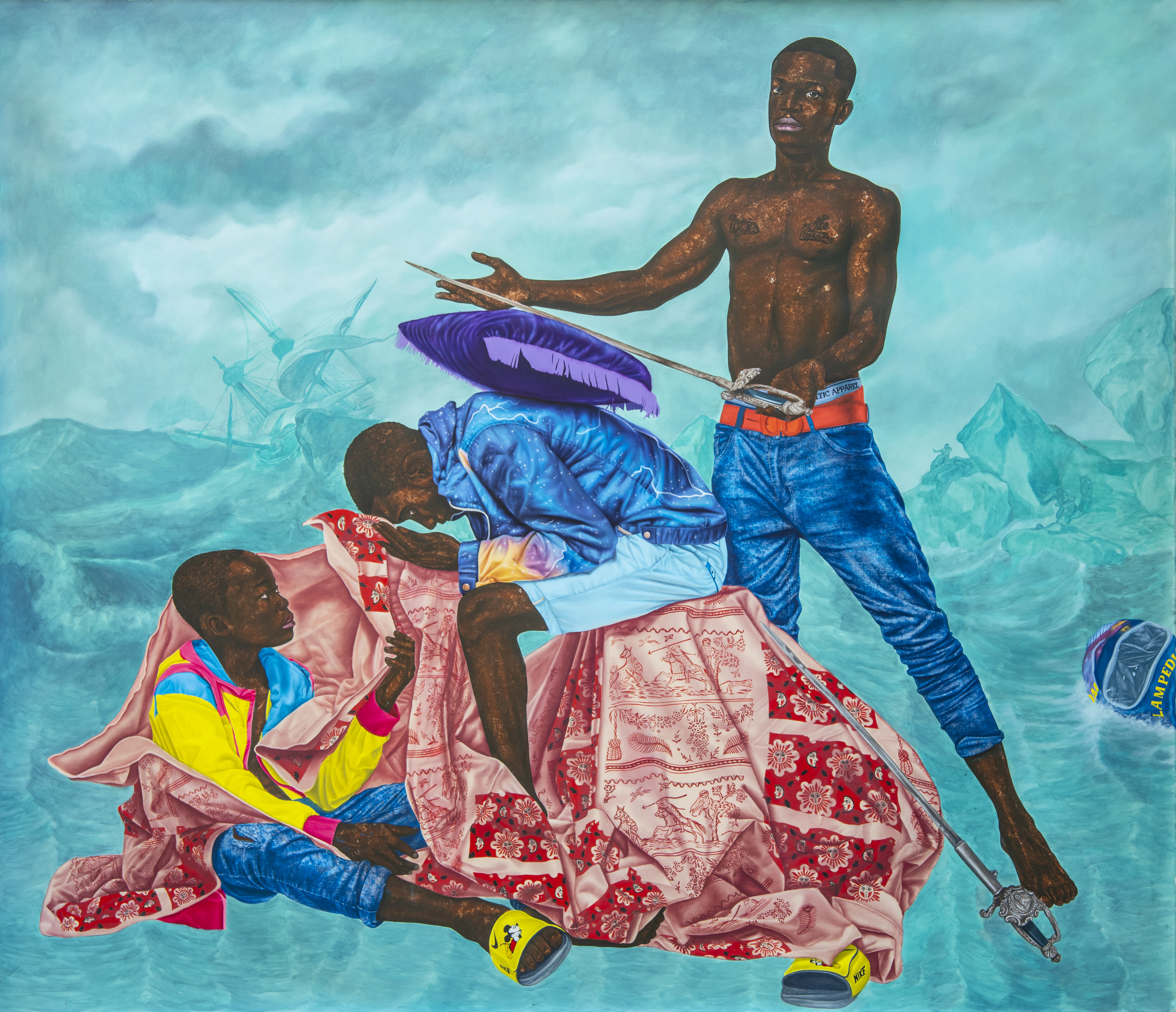 Hilary Balu conduit l’œil dans une fresque à la composition impressionnante ; réminiscences des mers tumultueuses de Turner ; vestiges des paysages de Frans Post, où l’esclave n’est plus ce personnage minuscule en arrière-plan, mais l’homme au centre, en grand, avec ses expressions de piété, avec ses postures lasses comme s’il était embarqué malgré lui, passifs, réifiés, volés. Certains regards sont lointains. D’autres se tournent vers le spectateur et semblent dire : « Vous voyez ? ». Au contraire d’Ulysse, le héros blanc qui combattit sur des terres étrangères et qui erra pour retrouver son Ithaque, les personnages d’Hilary Balu quittent leur terre natale et accostent les régions du monde qui, jadis, les ont exploités. Et si les troyens n’ont pas fui vers la Grèce, la jeunesse de la République Démocratique du Congo, elle, sans le savoir, reproduit la trajectoire des esclaves.