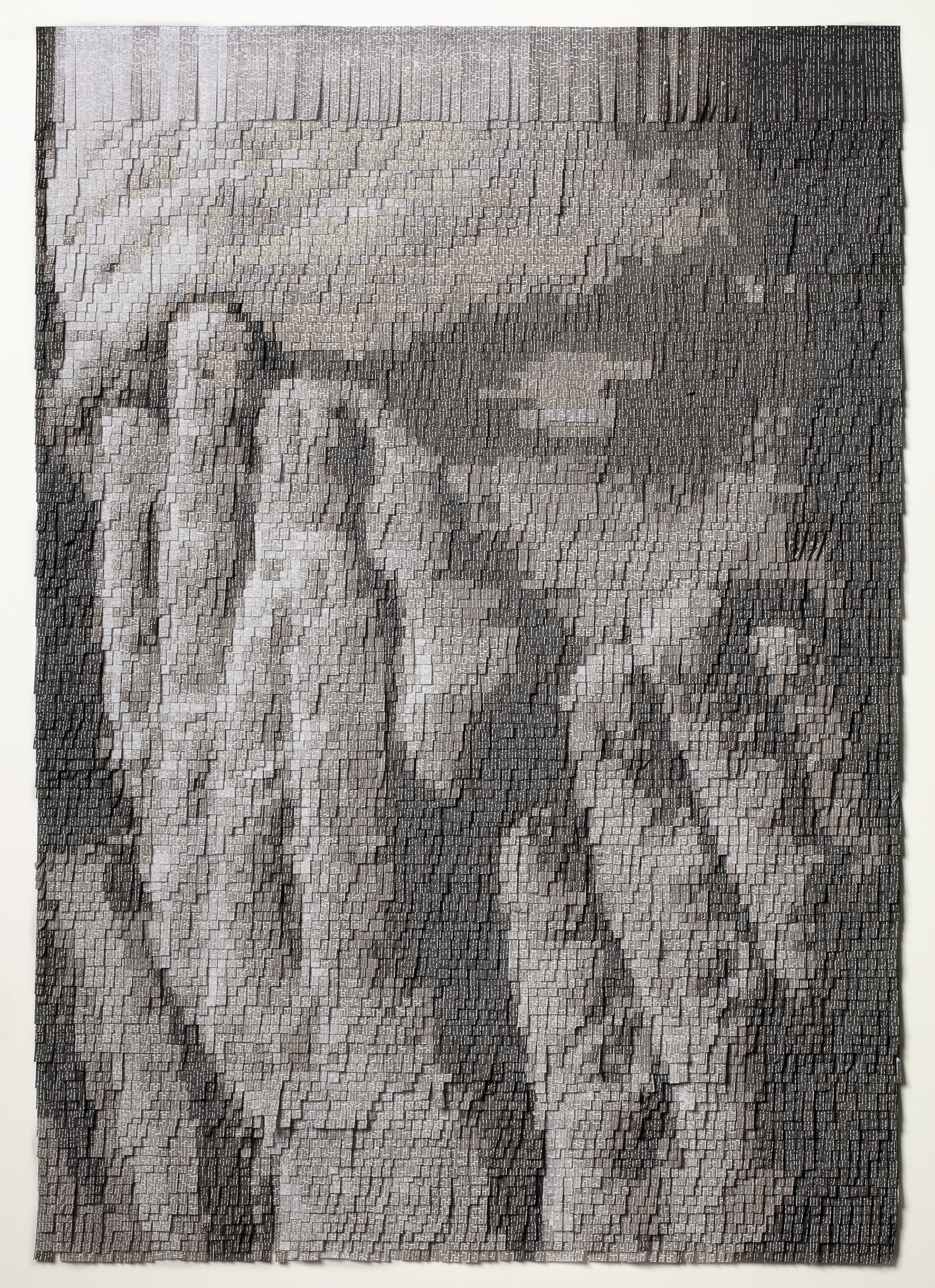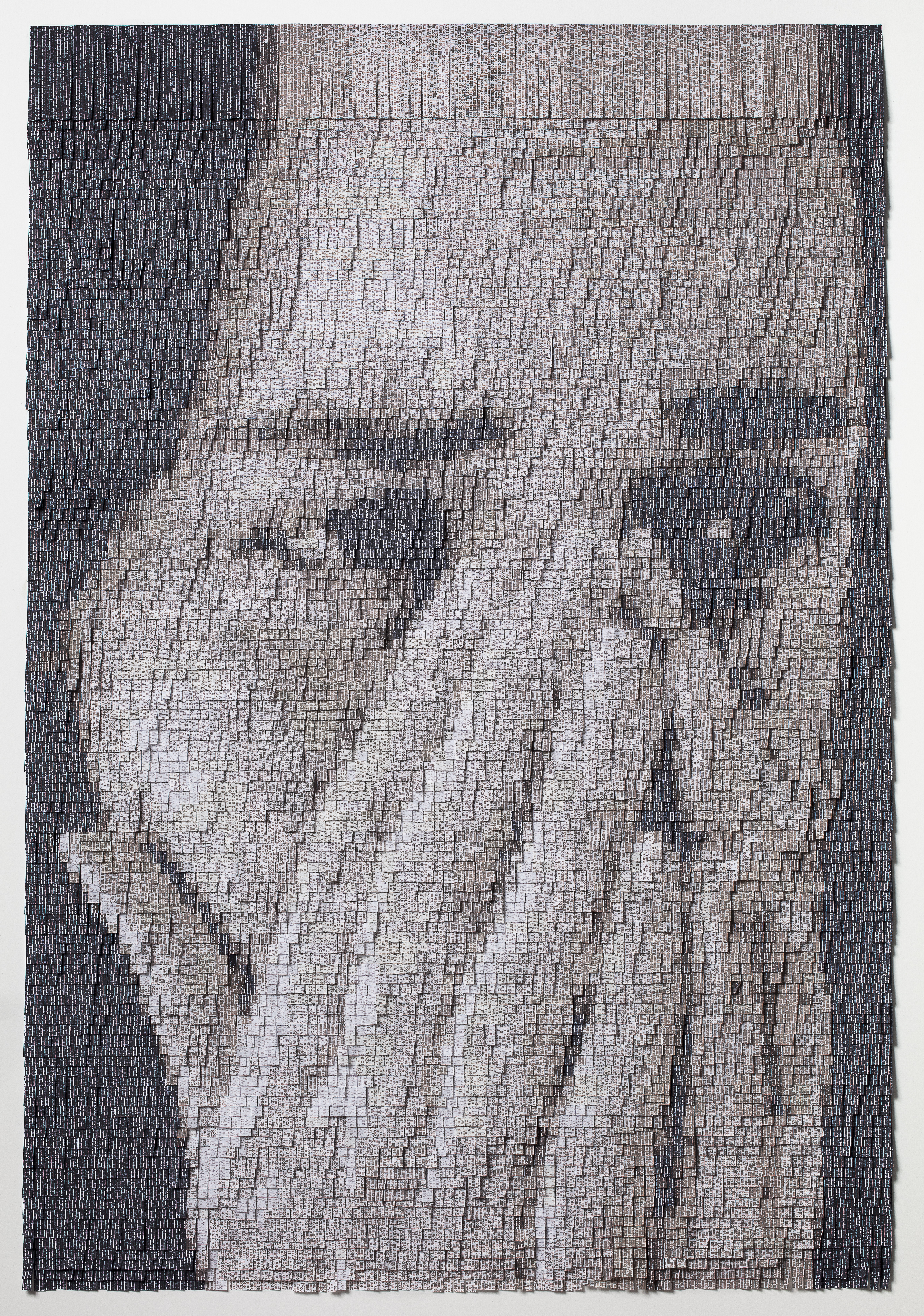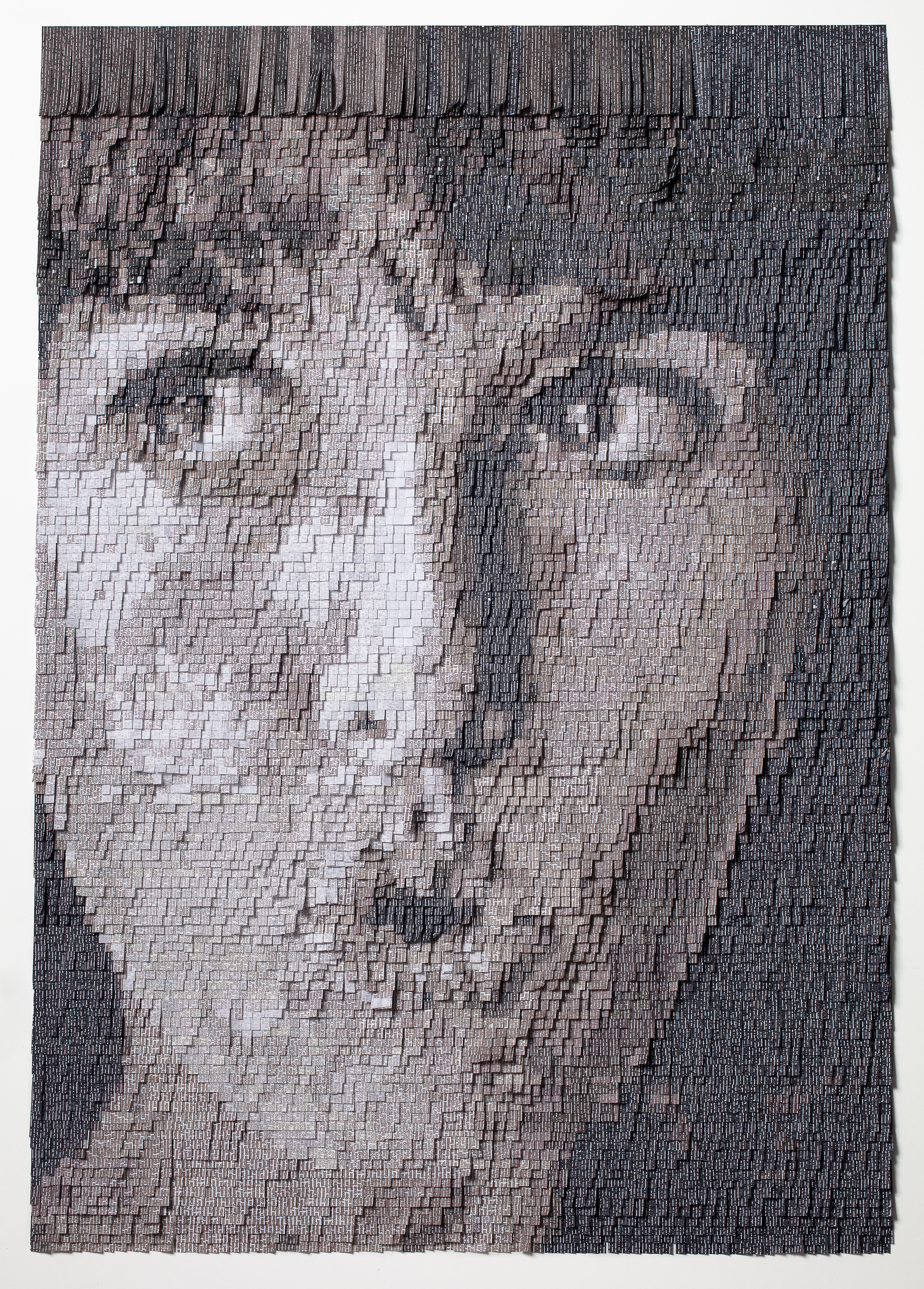 L’artiste s’applique ensuite à recréer les portraits en assemblant une à une les languettes de papier. La découpe nette, la finesse du papier et sa superposition créent des œuvres en volume. De près, le regard se perd dans un enchevê¬trement de lettres. L’image reconstituée se dé¬voile au fur et à mesure que l’on s’en éloigne et que l’œil s’accommode aux collages. L’artiste convoque dans ses œuvres des photographes historiques, Edward Curtis, Malick Sidibé ou Seydou Keïta… et s’intéresse à la photogra¬phie comme marqueur de mémoire. Elle ra¬vive le souvenir de figures, le sou¬venir d’une époque et de traces du passé.
