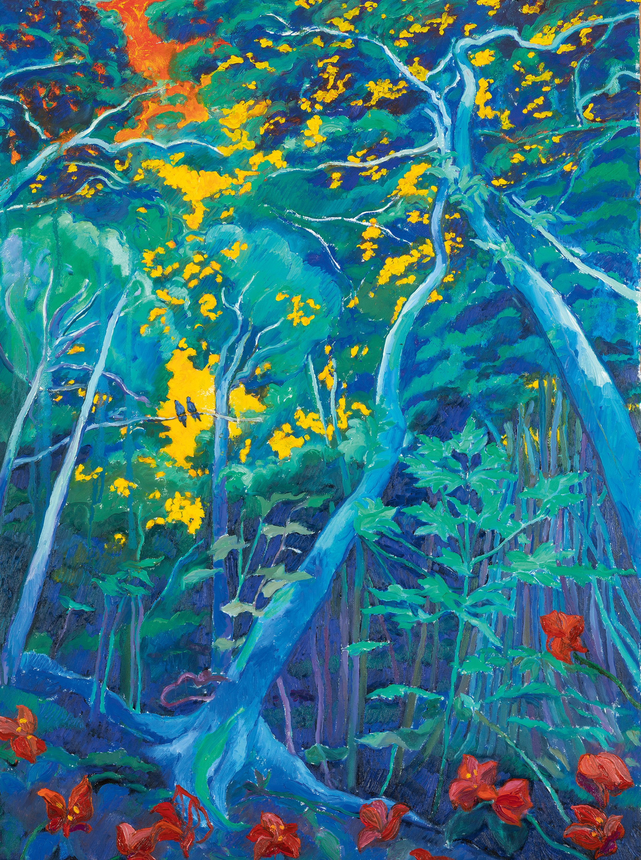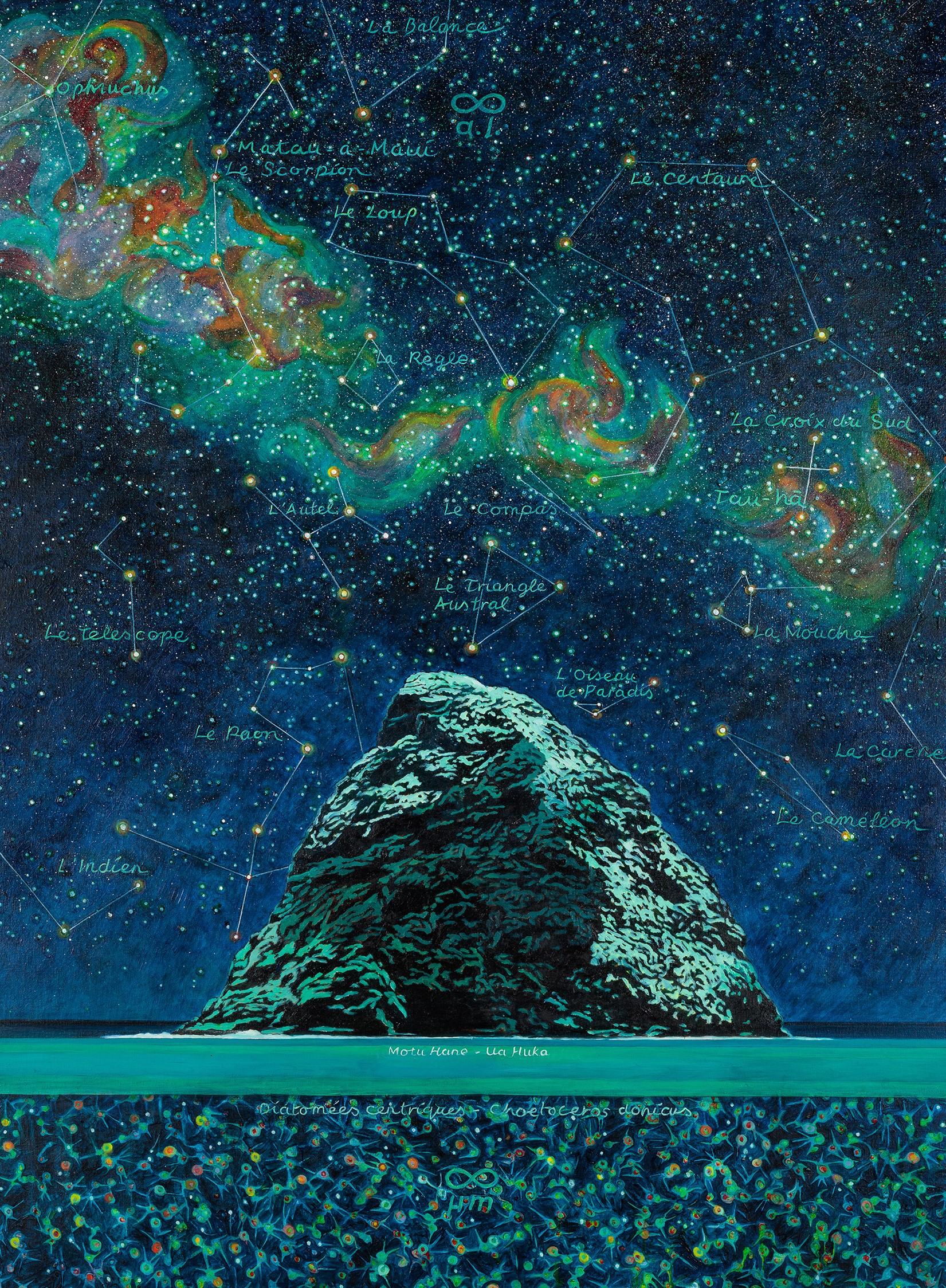 notre planète. Certains scientifiques le nomment Zone critique. C’est en résidant dans les îles polynésiennes du Pacifique que j’ai récemment pris la mesure de l’extrême minceur et de la grande vulnérabilité de ce minuscule espace habitable à la surface de la Terre qui accueille depuis des milliards d’années l’évolution du vivant auquel nous appartenons. Inspirées de cette merveilleuse explosion de biodiversité terrestre et marine, mes peintures sont autant de visions. L’ensemble des oeuvres présentées dans l’exposition et l’ouvrage forme un hommage au paradis terrestre ».